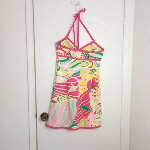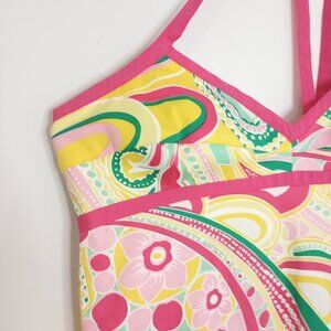 Tibi mod paisley halter sundress in colorful paisley print with pinks, greens, yellow & white colors. Hidden side zipper, fully lined. Pretty casual colorful summer dress, great for weekends and vacations, cruises.