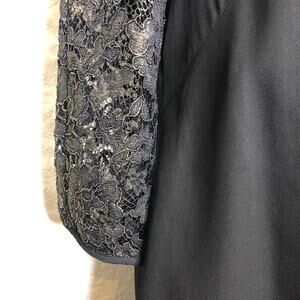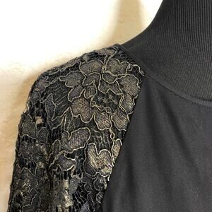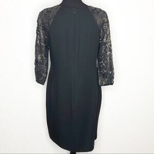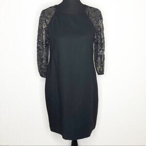 Tibi New York black sheath dress with black and gold lace sleeves. High crew neckline. Gold and black lace shoulders and sleeves. Sleeves are see through. Dress is fully lined. Zips in back. Size 10. Excellent pre-owned condition. 100% viscose.