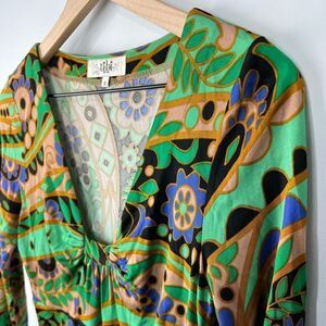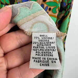 Pre-owned, good condition. Green/purple/black/gold/brown patter dress. Silk blend. V neckline and 3/4 sleeves. Pit to pit= 18”, shoulder to hem= 38”