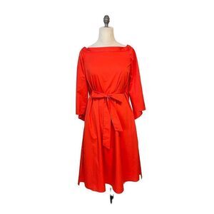 A vision in bright red, this Tibi dress falls with an elegant midi length and is cut with a trending off-the-shoulder neckline. Imagined in lightweight pure cotton, funnel cuffs make a statement of the sleeves while a waist tie cinches in the figure flatteringly. Finished with hem side splits, it’s calling for vertiginous heels and a statement necklace. Detail: US sizing Model is 178cm/5’10”, a UK 8 and wears a US 4 Colour: Red Off the shoulder elasticated neckline Funnel sleeves Waist tie Hem side splits Pure cotton Dry clean