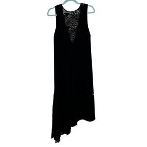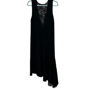 Sleeveless shift dress featuring guipure lace insets and an asymmetrical slit with metal hardware detailing