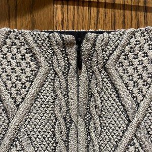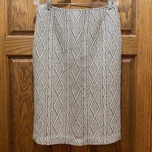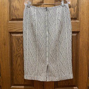 Stylish and unique Tibi pencil skirt. This skirt has a beautiful raised pattern, back vent, and zips in the back. I am not sure what material it is made out of as I cannot find an inner tag. It is very soft though, and I believe the liner is cotton.