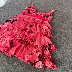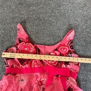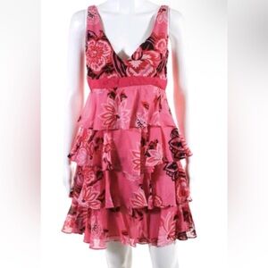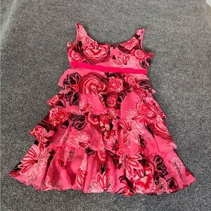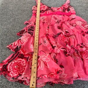 Vibrant pink dress with floral pattern. Features ruffle layers and sleeveless design. Perfect for summer occasions.