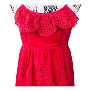 Tibi Red Eyelet Ruffle Halter Top Size 4 Cotton Neck Straps Open Back Side Zip