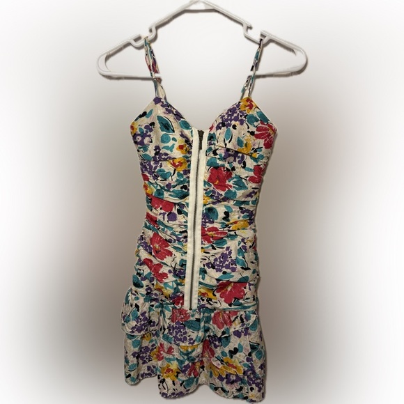 Beautiful 100% silk ruched floral mini dress by Tibi (Style #60473). Features a bold multicolor floral print with shades of red, teal, yellow, purple, and black on a cream base. Front zip detail, tiered ruffle hem, and flattering ruched body for a chic, feminine fit.