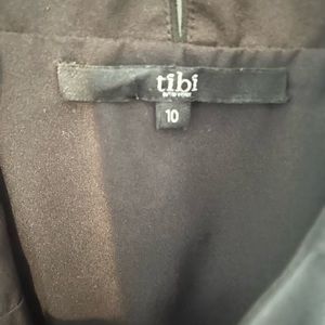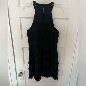 Excellent used condition black Tibi 100% silk ruffle dress in size 10. Zips up the side and fastens in the back behind the neck.