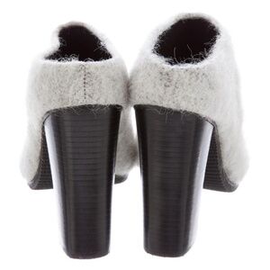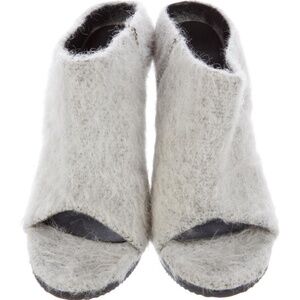 Tibi Leona Mohair alpaca & virgin wool ice grey slide/mule with open toe elasticized gore panels at uppers chunky stacked block heels.