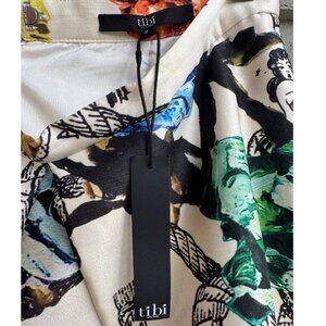 Stunning Tibi “Tattoo Print” silk skirt featuring bold painterly florals and rope details on a creamy base. Fully lined with hidden side zip.