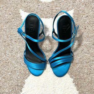 Tibi Vivian Satin Strappy Sandal Heels in Blue Orchid in great preowned condition. Size 37 which is according to Tibi’s size chart, equivalent to US 7. Heel height is 4.5”