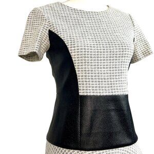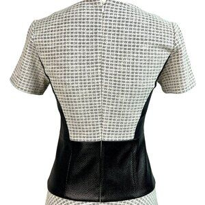 Tibi Whitby Faux Leather Panel Fit & Flare Dress Size 2 Short Sleeve Stretch Tweed Monochrome