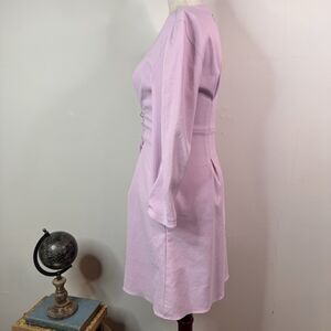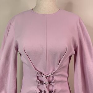 Tibi pink chalky drape dress with front lace up corset featuring modern silver hardware and oversized tie. Zip back with pleated detail. Crew neck. Polyester.