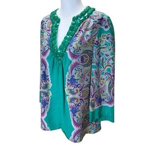 Tibi - Women’s Vintage Blouse, Paisley Silk Beading Tunic V-Neck - Green, Size 4