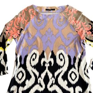 Tibi dress, black and white Aztec pattern with beige, purple, pink and yellow upper portion Aztec pattern, sheat style, 3/4 length sleeves, stretchy