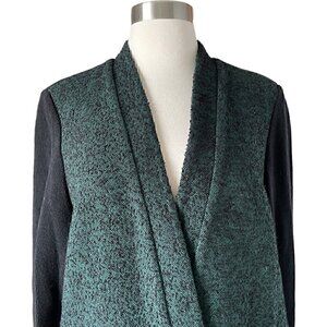 Keywords: tibi blazer, open front blazer, shawl collar jacket, sweater jacket, green and black blazer, wool blend coat, knit sleeve blazer, modern workwear, designer layering, transitional jacket, fall fashion, winter office style, contemporary brand, Tibi, open front blazer, wool blend jacket, draped front, green and black, modern blazer, long sleeve jacket, structured knit, designer outerwear, fall fashion, winter layering, minimal chic, luxe basics, tailored silhouette, professional style, soft wool blend, asymmetrical hem, cozy workwear, boutique brand