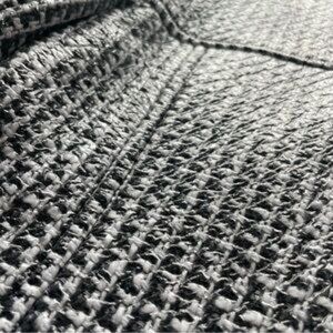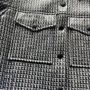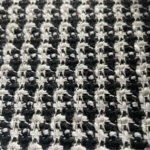 Super cool and unique jacket from Tibi, I’m pretty sure it’s an unproduced sample and might be one of a kind! It’s a shape Tibi’s had before, in a knit black and white houndstooth pattern. The outside of the fabric has a thin plasticy coating, so it has a fun, almost patent, shine. Fair warning, it does make some noise! The style has a large pointed color, front pockets, side pockets, matte black snaps, and signature metal loop detail. The inside is unlined with extra finishing at the cuffs and hems.