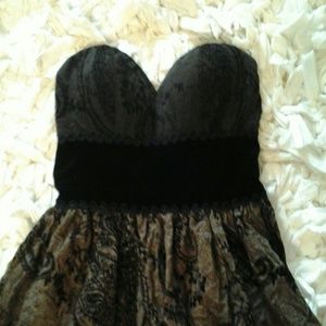 Crinkle, strapless, zip back,taupe, blackm br8wn, full skurt, acrylic, poly, wool, dry clean