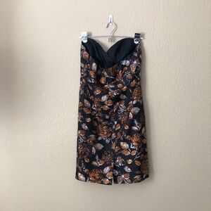 Side zipper closure. Flattering cross over sweetheart neckline. Very pretty floral print. Pleating detail around the waistline. Fully lined. 100% silk
