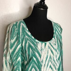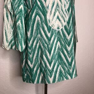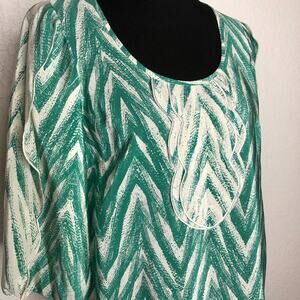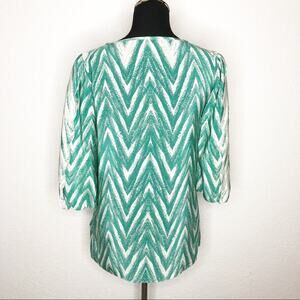 Tibi green and off white scalloped trim silk top. Pullover style with scoop neckline. Scalloped trim at neckline and down the sleeves. Midlength sleeves. Size 8. Excellent preowned condition. 100% silk.