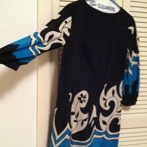 Tibi size 2 silk long sleeve dress. Black with white and blue pattern. Great for holiday parties!