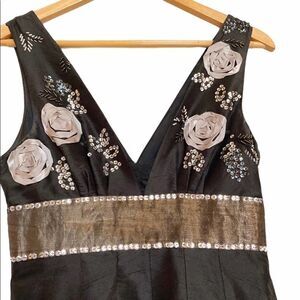 Tibi green tag VTG. A-Line V-Neck Sequined Floral 100% Silk Cocktail midi dress. 100% silk lined. Bottom pleating. Beading and sequins adorn this dress with roses and pizazz! V neck in front and back with cute lace detail in front. Side zip closure. Perfect evening dress for mother of the bride, bachelorette, fancy dinner or even the opera!