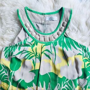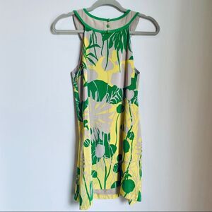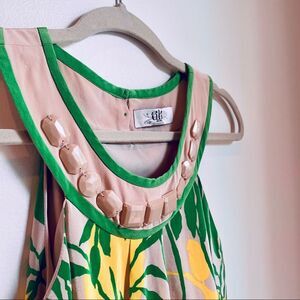 Yellow Green Floral Patterned Silk Sleeveless Embellished Casual Dress