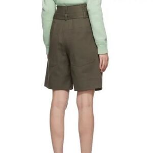 Worsted cotton gabardine shorts in blue. High-rise. Four-pocket styling. Belt loops and detachable belt with cinch fastening at waistband. Pleats at front. Zip-fly. Silver-tone hardware.