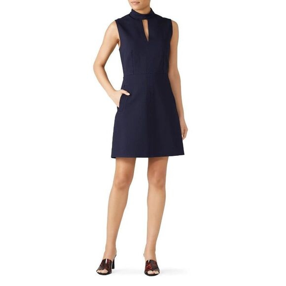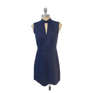 Navy crepe (61% Rayon, 35% Polyamide, 4% Elastane). Hourglass. Sleeveless. High neck with slit. Invisible back zipper closure. Side pockets