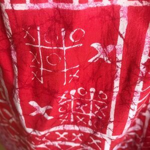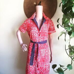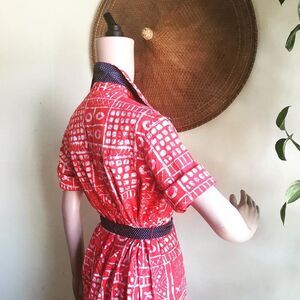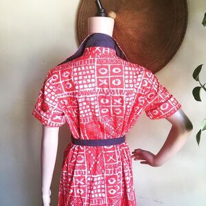 1960’s dress with TIC TAC TOE batik print! Wing tip collar, red buttons, half sleeves, shift cut with contrast tie belt, side kick pleats with polka dot print in navy & white and the TIC TAC TOE print! Serbin label.