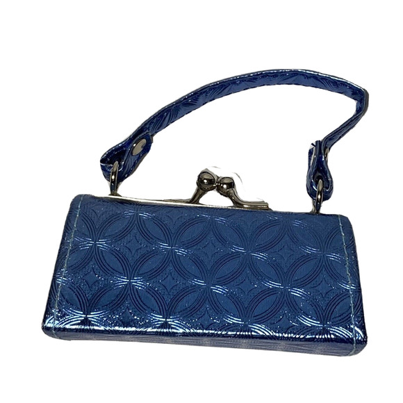 Tic Tok Mini Lipstick Coin Purse Shiny Blue Geometric Pattern with Removable Handle Silver Kissing Clasp
