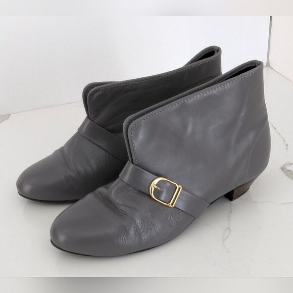 Tic-Tac-Toes Women's gray BobbiBoot Leather gold buckle strap Pull-On ankle short round toe small heel comfortable Booties boots shoes Size 8 Wide