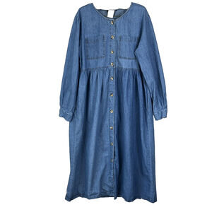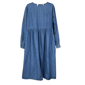 The Tickets Dress in size 11/12 is a vintage-inspired blue denim chambray maxi dress with long sleeves and a round neckline. This casual dress features a button closure, made of 100% cotton denim fabric, and is perfect for a coastal cottage or prairie style. It also has a lightweight feel and comes with pockets, making it an ideal choice for the fall and spring seasons. The dress has a Western, bohemian, and 90s retro theme, representing a hippie, effortless, and classic style. Made in the United States by Tickets Clothing, this dress is a versatile addition to any woman's wardrobe.