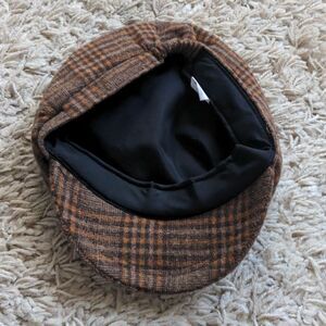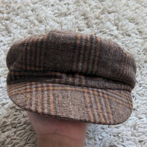 This preloved Tickled Pink Brown Plaid 70s Inspired Beret Newsboy Cap is a great addition to your accessory collection. Brown plaid pattern, elastic back band, adult size. Academia, vintage inspired, bohemian.