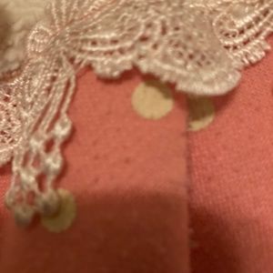 Unbelievably cute girls coat adorned with pastel polka dots and the cutest furry mouse pockets! Lace crochet like detailing at waist line and lined with Sherpa under striped patterned inside line. Peter Pan collar with dangling lace! Super cute so many compliments await! It’s very warm should fit ages 5-7 depending on child some wear, bc too cute, no stains, piling !