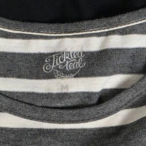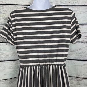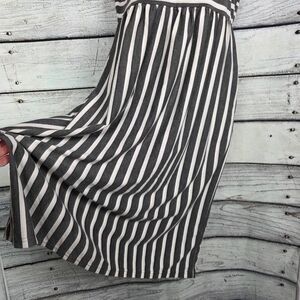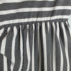 Classic Tickled Teal midi dress with horizontal stripes on top and vertical stripes on the skirt for a flattering contrast. Made from a soft, stretchy blend of 60% polyester, 35% rayon, and 5% spandex. Features short sleeves, a crew neck, and a relaxed fit for effortless everyday style.