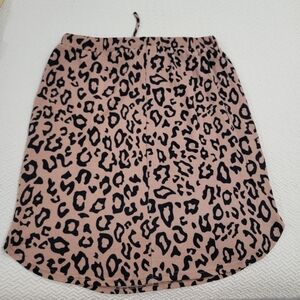 Leopard Print Knee length knit skirt. Elastic waistband with drawstring tie. Slip on style v