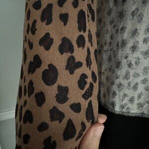Stylish cardigan with leopard print and colorblock design. Features black and tan colors.