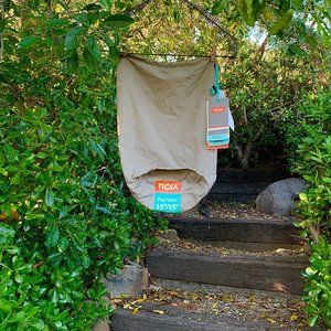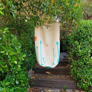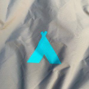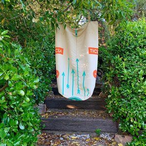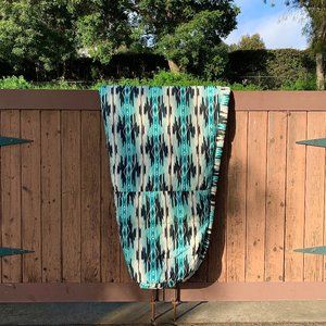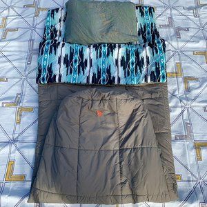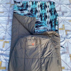 You will sleep well in this luxuriously soft and happy cocoon! Function is of great importance, but so is aesthetics. In this case you can have both. The turquoise, black, and clay color combination, along with the Aztec pattern are reminiscent of the era of Fred Harvey, Route 66, Thunderbird, and Joshua Tree camping. Sadly Ticla is no longer in business, but they sure outdid themselves with this sleeping bag. The bag is designed where the orange tent icon side has thicker insulation, the turquoise tent icon side has less insulation, and depending on your warmth preference, you choose which side goes on top. For those with sweaty feet, the two way zipper allows air to circulate at the bottom. Unzip it all the way and you have yourself a comforter to share with a friend while sitting on the couch binging on Netflix. Comes with a compression stuff sack and a long term storage sack. Measures 32" x 72". Condition is pristine.