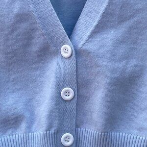 v-neck, short sleeve cardigan, cropped cardigan, front button, short sleeve, blue cardigan, crop top silhouette, coquette, girly, soft girl
