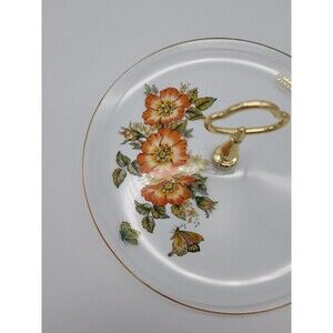 This stunning Viking Glass tidbit serving tray is a must-have for any collector of Mid-Century Modern decor. The tray features a beautiful floral and butterfly pattern on a round glass surface, with a glossy finish and gold trim. Its vintage origins in the United States make it a unique and rare find for any home.