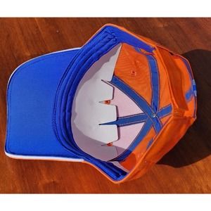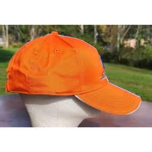 Tide Racing hat baseball cap. The hat is orange. There is a white and blue stripe down the middle of the hat and brim. The lettering is embroidered blue. The brim is orange ribbed with orange thread. It has a strap for adjustability.