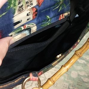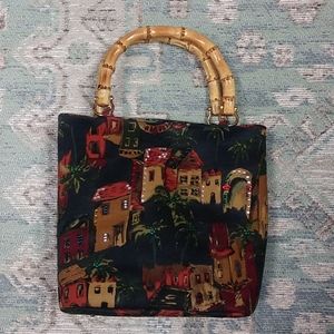 Adorable handbag. Little town print featuring homes with sequins and palm trees. 4 metal feet on the bottom. Bamboo handles. One zipper pocket on the interior. Condition is excellent. Will supply measurements upon request.