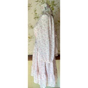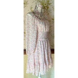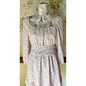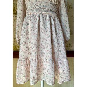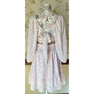 Super cute tie back lantern sleeve mini dress. The sleeves are elbow-length and have an elastic band around the cuff. This dress has a square neck and can be worn off the shoulders. This dress is made with a beautiful soft pink and rose print material. The outer shell is sheer and has a soft lining.