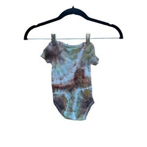Handmade baby onesie, ice dyed using a geode tie method. This garment was upcycled to give a pre-loved piece a second chance and was dyed using professional grade fabric reactive dyes. Each piece is dyed using organic and jeweled toned inspirations so one can bring more fun to their everyday wardrobe or have a fun, standout statement piece.