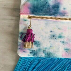 DETAILS: Foldover clutch; gorgeous purple and blue tie dye colors on white; teal blue fringe on bottom; purple and gold tassel zipper; rose gold zipper; large inside - will fit a phone, wallet, and other essentials!