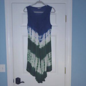 semi-shear beach dress in a blue, white and green tie dye style print with blue embroidered detail