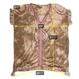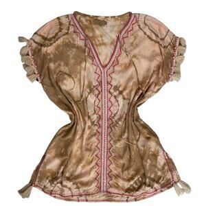 Skemo Tie Dye Kaftan Tunic Small Pink Tan Boho Chic Embroidery Tassels Festival Hippie