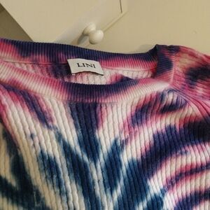 Details: A long sleeve tie dye ribbed knit sweater. Luxurious knitted feel. So comfy and trendy. material is Viscose and Nylon.