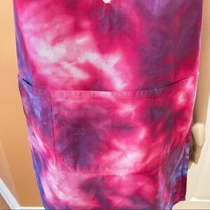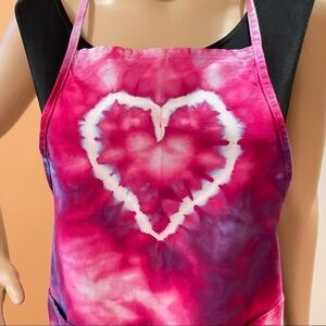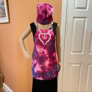Hand tie dyed ice dyed child size (big kid) apron and matching toque chef's hat. Features a heart on the chest, and the body is covered in varations of purple. Features three handy pockets for spoons, spatulas, phone, etc., and an adjustable tie in back, dyed to match. The chef's hat has elastic in back for an adjustable one-size-fits-most fit. Perfect present for your budding chef or favorite kitchen helper. Professional-grade dyes won't fade with washing. Brand new; tags only removed for dyeing.