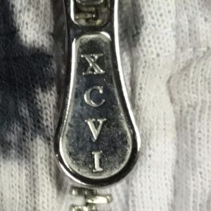 Tie dye zip up hoodie / jacket by XCVI. Has scoop neckline and two pockets in front. Comfortable sweatshirt material. No tags, but zipper pull indicates that this is XCVI. Most likely size small, measures about 18 inches across from armpit to armpit and 21 inches in length. Sleeves are about 25 inches long. B1