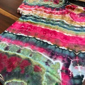 Vibrant ice dyed t-shirt using geode pattern. I used a mix of earthy greens with pink. Procion dyes were used so colors will stay vibrant wash after wash.